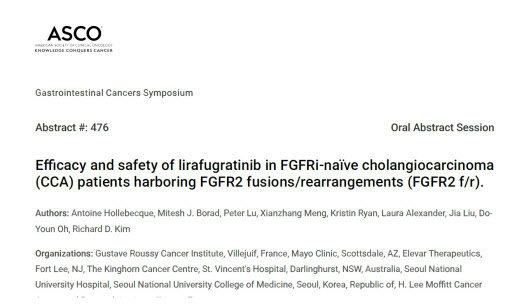 12일 업계에 따르면 리라푸그라티닙의 FGFR2 융합·재배열 담관암 환자 대상 임상 2상 결과가 지난 9일 ASCO GI 2026의 ‘구두 초록 발표 세션(Oral Abstract Session)’에서 공개됐다.