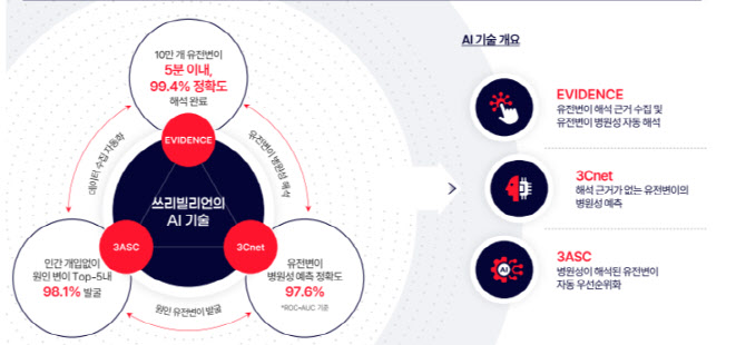 쓰리빌리언의 핵심 경쟁력으로 AI 기반 변이 해석 기술 쓰리씨넷(3Cnet)이 꼽힌다. 전장유전체 검사를 하면 통상 500만개에 달하는 유전자 변이가 쏟아진다. 쓰리빌리언의 AI는 이 가운데 질병 원인이 될 가능성이 높은 후보를 상위 5개 수준까지 압축해준다.
