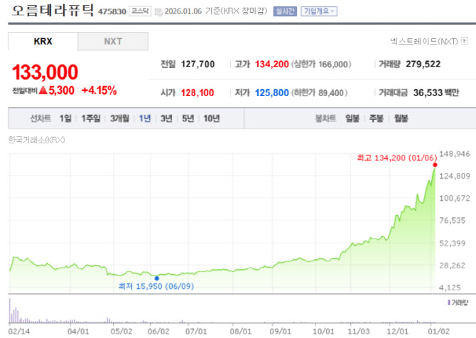 지난해 2월 코스닥 시장에 입성한 오름테라퓨틱의 주가가 거침없이 오르고 있다. 6일 오름테라퓨틱은 장 중 한 때 13만4200원까지 오르며 52주가 신고가를 경신했다. 시계열을 확대해보면 지난 6월 9일 1만5950원으로 최저점을 찍은 이후 꾸준히 주가가 상승했다.