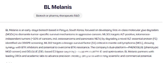 비엘멜라니스는 지난해부터 신개념 표적 단백질 분해(TPD, Targeted Protein Degradation) 기술을 기반으로 한 항암신약을 연구개발 중이며, 최근 미국에서의 동물실험에서 유의미한 효능이 확인된 것으로 알려졌다.