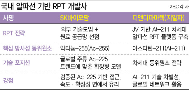 한 바이오업계 관계자는 알파선 기반 RPT가 글로벌 항암제 개발의 차세대 트렌드로 떠오르고 있다면서 이같이 말했다. 이러한 흐름 속에서 국내 기업인 SK바이오팜(326030)과 디앤디파마텍(347850)은 서로 다른 전략으로 존재감을 키우고 있다.